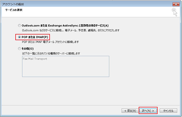サービスの選択欄では、【POPまたはIMAP】を選択して【次へ】をクリックします。
